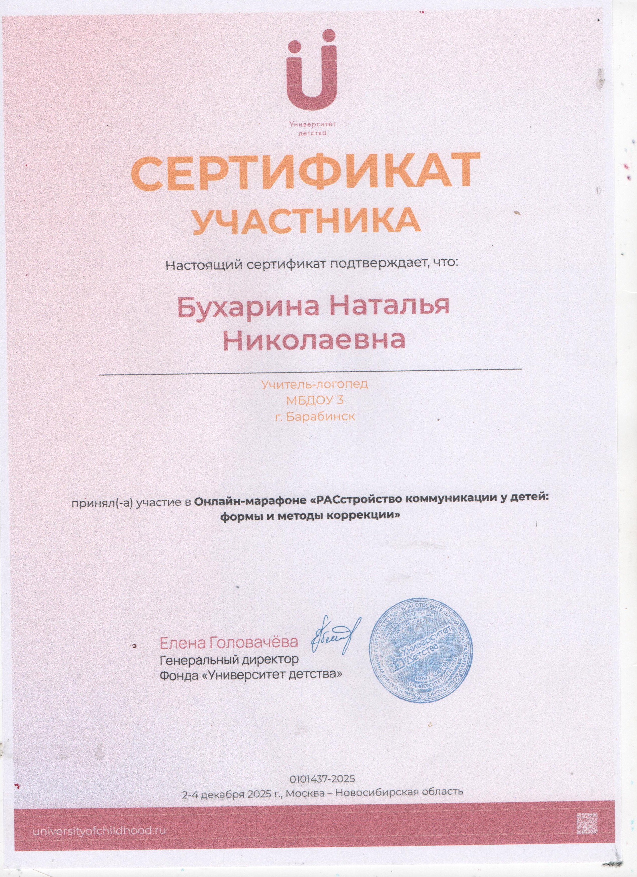 Сертификат участника в онлайн-марафоне "РАСстройство коммуникации детей: формы и методы коррекции" от Института детства. г.Новосибирск