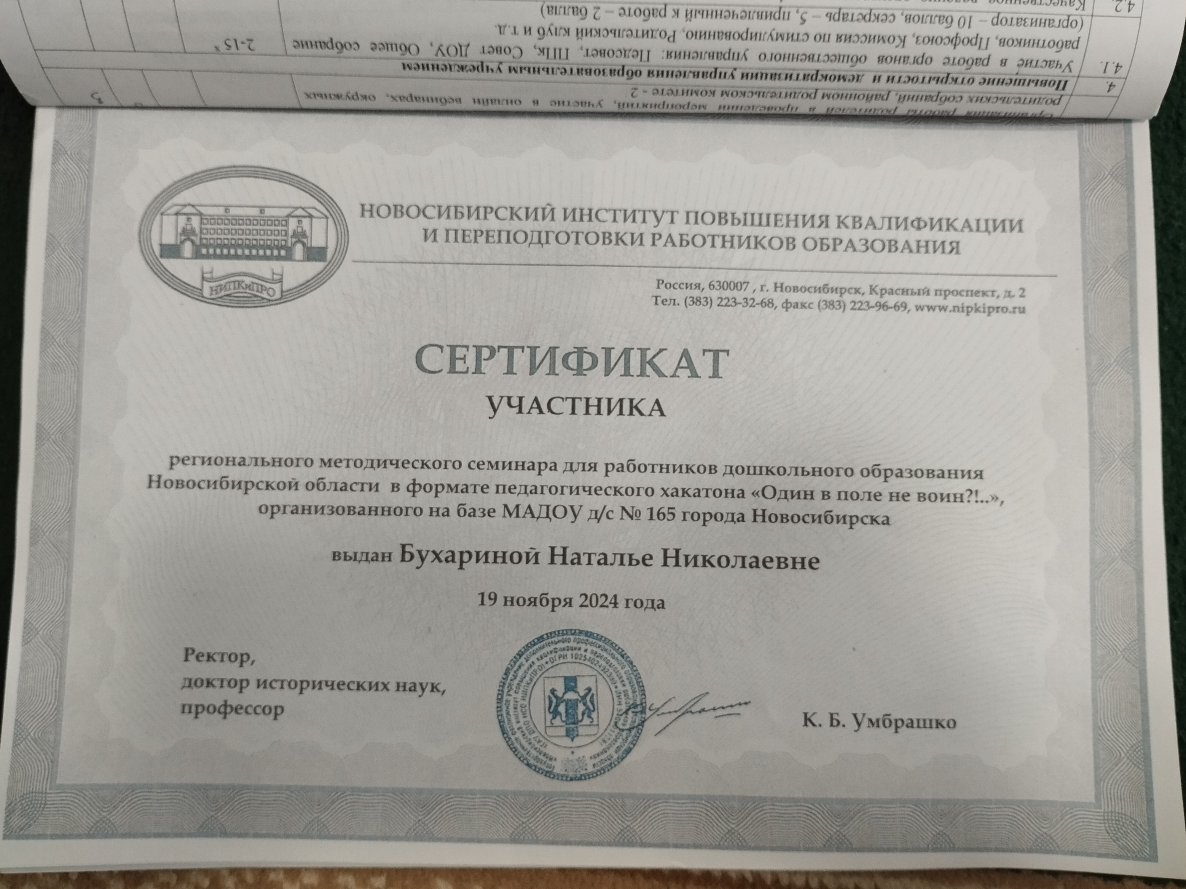 Сертификат участника регионального методического сериала для работников дошкольного образования Новосибирской области в формате педагогического хакатона "Один в поле на воин!?.."