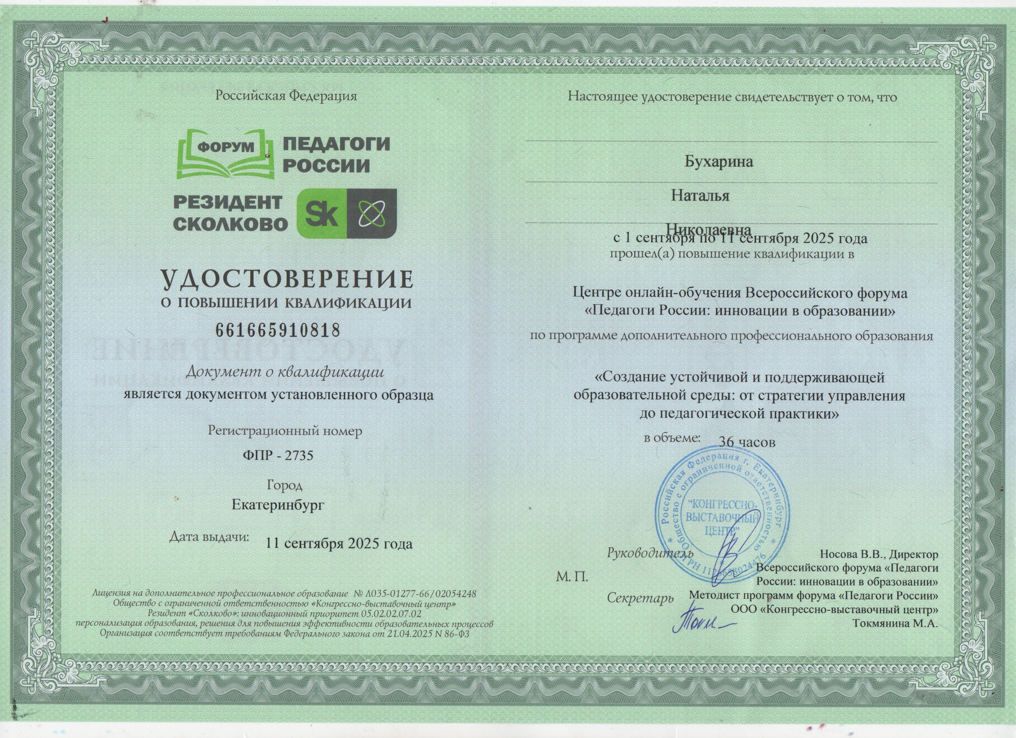 Удостоверение о повышении квалификации "Создание устойчивой и поддерживающей образовательной среды: от стратегии управления до педагогической практики"