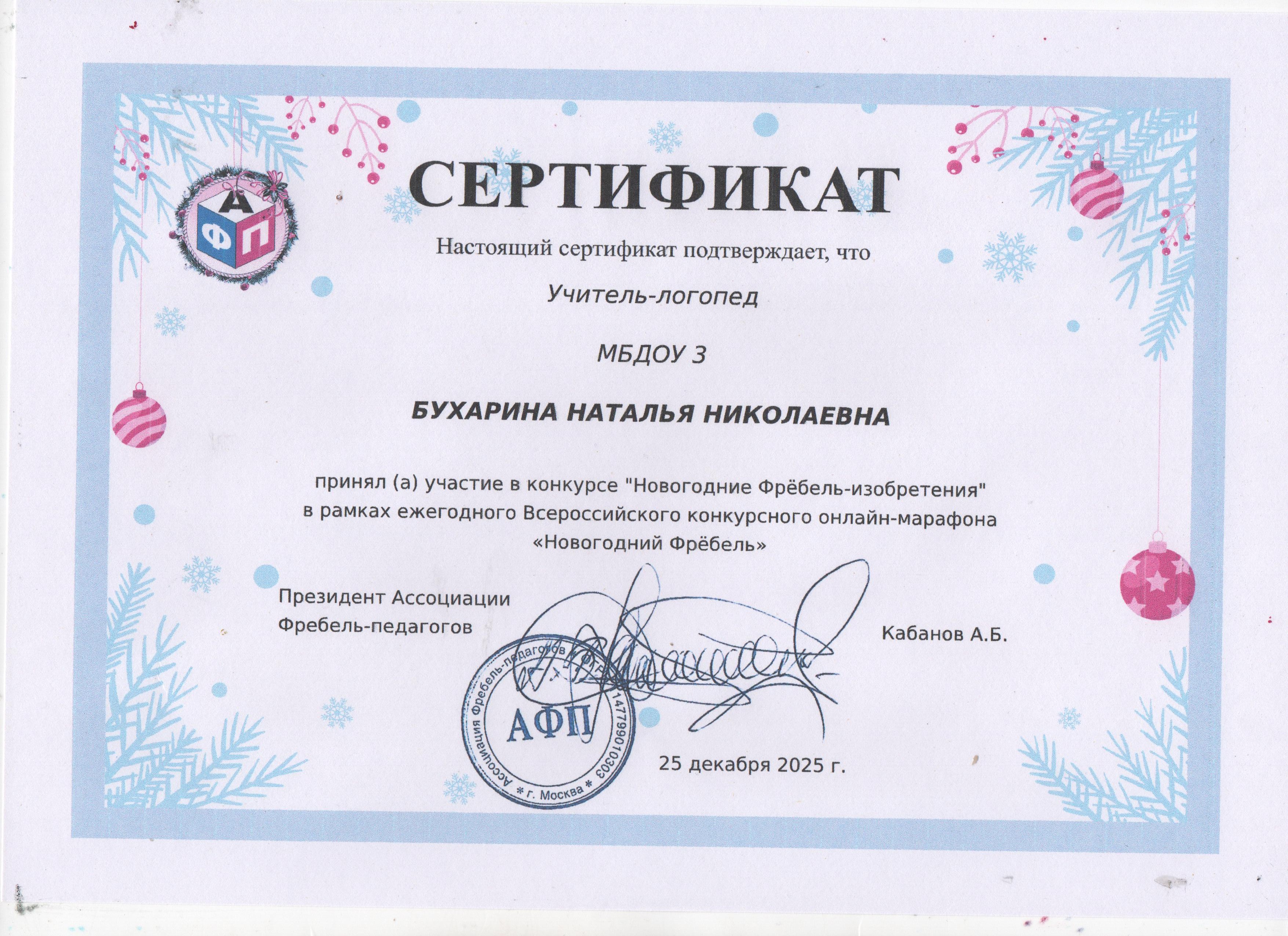 Сертификат участника конкурса "Новогодние Фрёбель-изобретения"2025